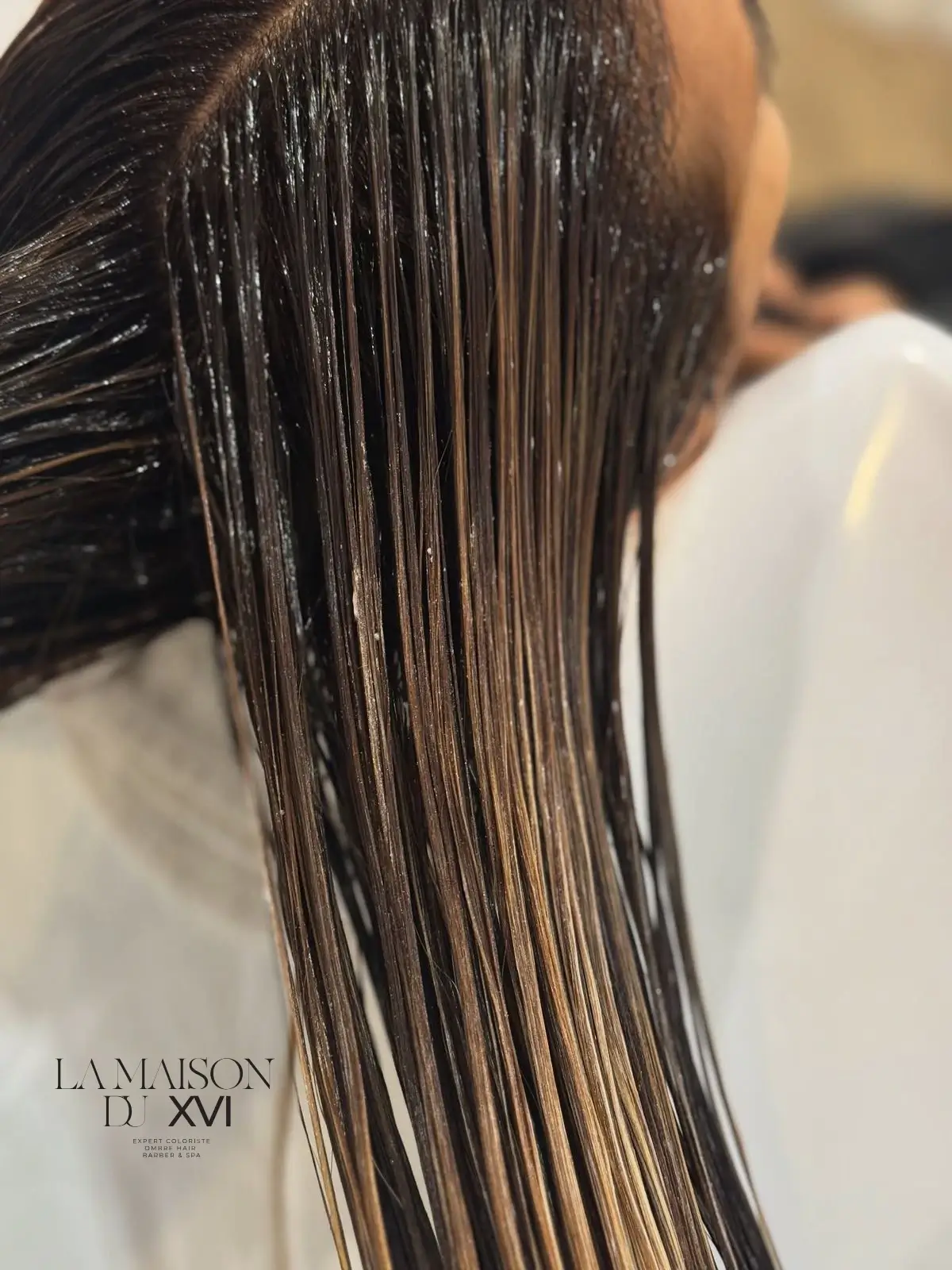Soin Sublimateur : Application d’un soin spécifique à La Maison du XVI pour apporter du relief et de la brillance à la fibre.